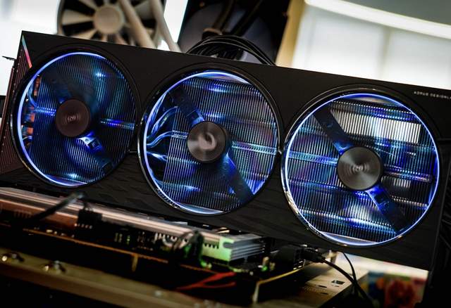散热系统是这款显卡的核心亮点,其搭载了升级后的WINDFORCE风之力散热系统,3把90mm风扇采用7片不规则仿生扇叶设计,相比传统光滑扇叶,进风量提升15%,同时扇叶边缘的降噪导流槽可减少气流扰流,降低运行噪音;风扇支持智能启停,低负载时完全停转,实现零噪音体验。