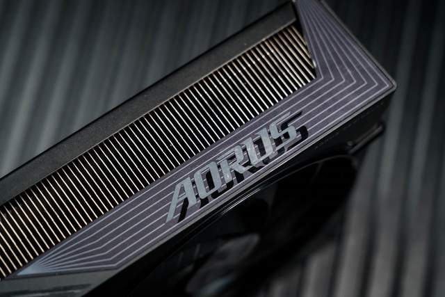 技嘉RTX 5060 Ti小雕16G采用三风扇设计,虽定位是AORUS入门款,但用料毫不缩水。外壳为磨砂质感搭配三角形纹理和放射点状图案,背面则是一体式镂空铝合金背板,左侧是AORUS的logo图案,中间则是白色的斜切装饰,提供美观的同时保护PCB。