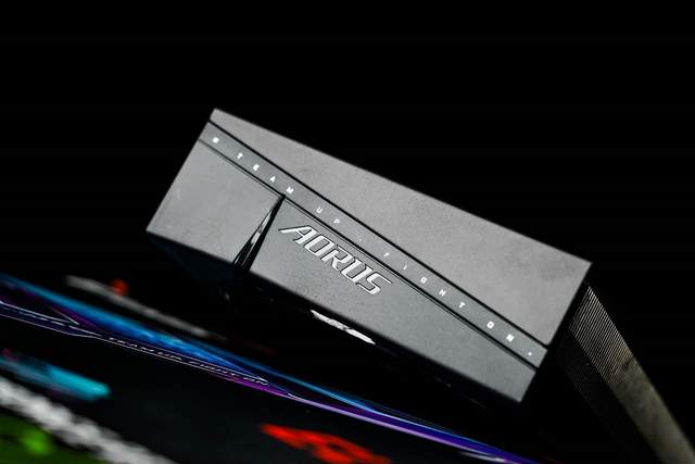 显卡的尾部同样设计了AORUS的字样,搭配TEAM UP FIGHT ON的字样,激起玩家的游戏热情。这款显卡延续了8pin(6+2)的供电接口,具有更好的兼容性,老平台不用更换电源或转接线也能直接升级。