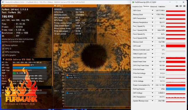 技嘉RTX 5060 Ti小雕16G在1小时左右的烤机测试中GPU温度仅为60℃;显存温度更是低至52℃;风扇转速为1484 RPM(负载50%)。在TDP 100%的满载情况下,整卡功耗为180W。
