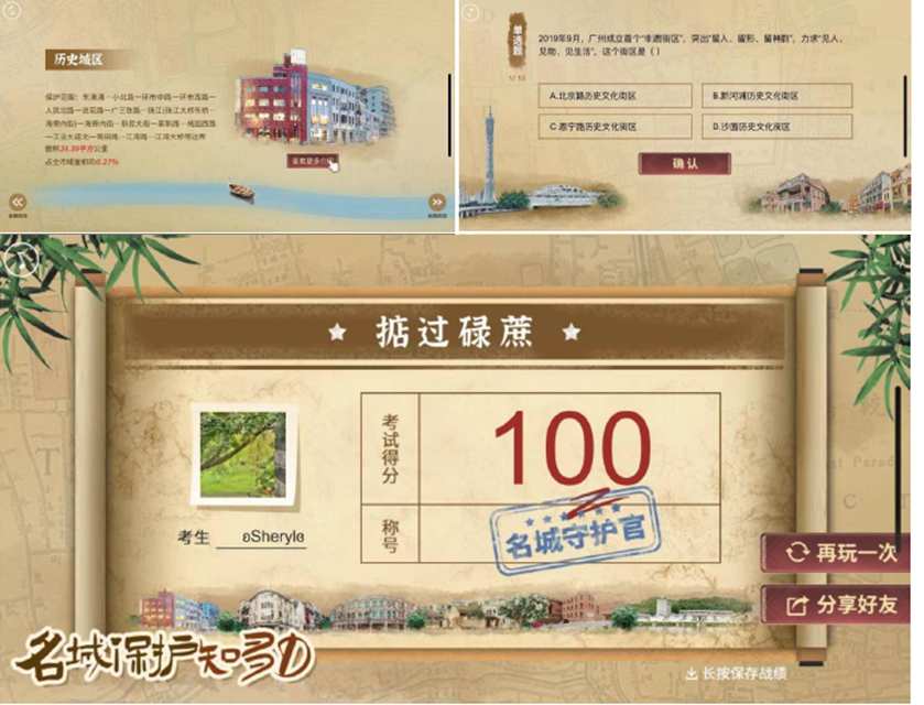 承故探新,共“筑”老城新生。以“文化+科技”的互动呈现方式,探索利用历史建筑在线地图、H5网页、数字化艺术创作等多种科技手段普及遗产价值和保护知识的遗产教育路径。汇集名城守护官的所探所得,结合“历史建筑在线地图”,构建数字文保在线展示广州841处历史建筑,以专业角度、通俗方式综合呈现城市建筑历史;制作“名城保护知多D”H5知识问答网页,以创新互动的形式介绍广州历史文化街区、文物、历史建筑、传统村落的总体情况,互动引导市民更深刻、快速地了解相关知识;探索遗产教育与“计算机生成艺术”相结合的创新路径,计算机根据公众选取感兴趣的历史建筑元素,利用算法自动生成专属的电子艺术画作,实现“参与式”“共创式”的互动体验,让名城广州的历史文化资源焕发出新的活力。