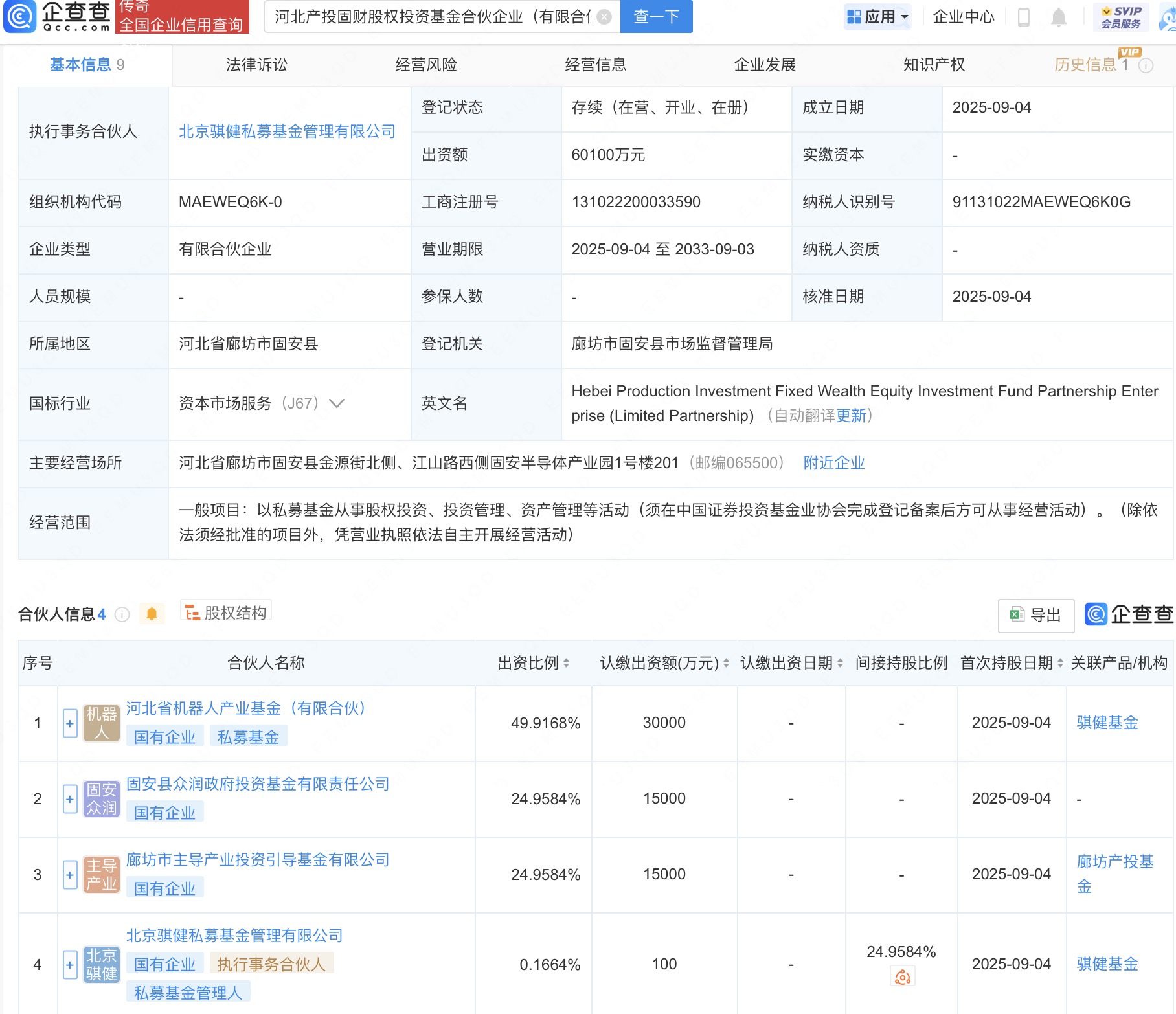 近日,河北产投固财股权投资基金合伙企业(有限合伙)成立,出资额6.01亿人民币,经营范围为以私募基金从事股权投资、投资管理、资产管理等活动。企查查股权穿透显示按天配资利息,该企业由河北省机器人产业基金(有限合伙)等共同出资。