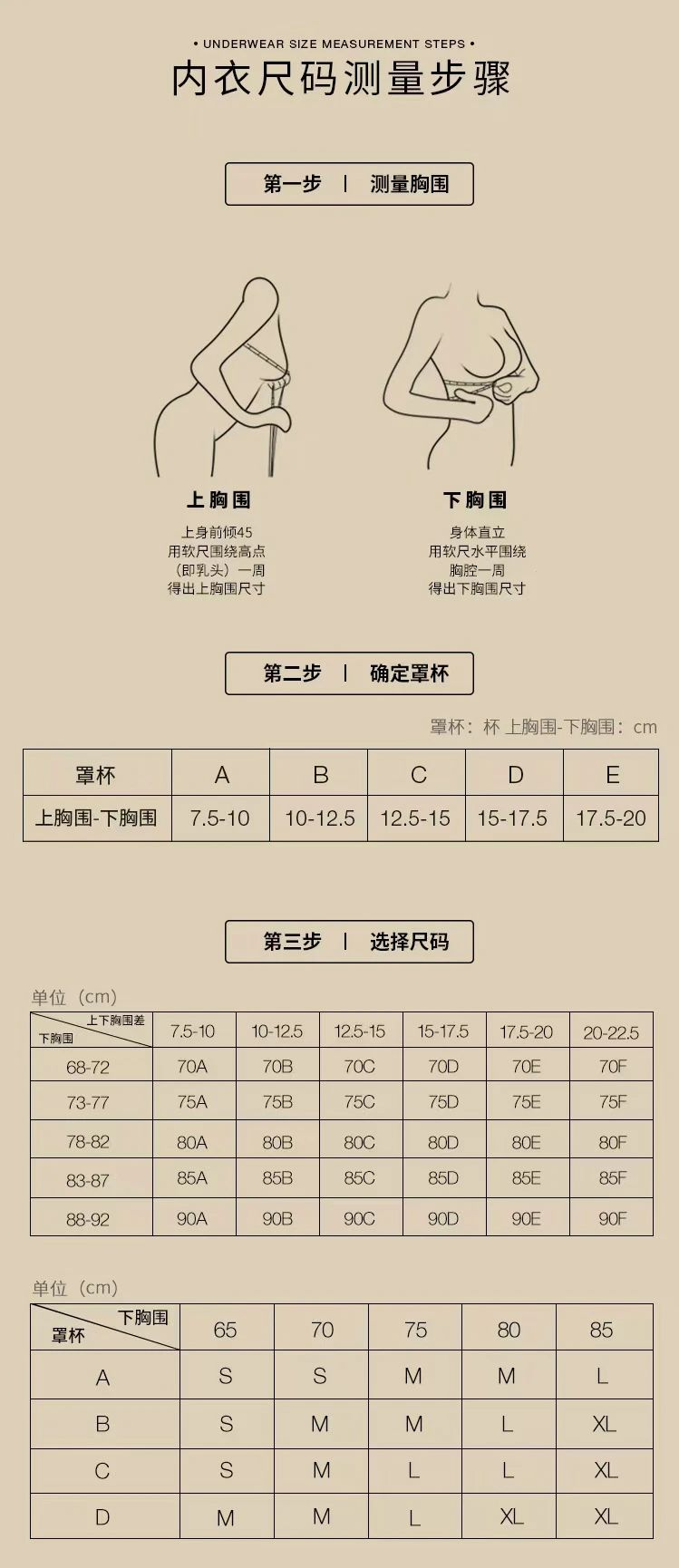 如果拿不准,建议大家先测量下胸部围度再进行选择,这样买回去的内衣才更合身好穿: