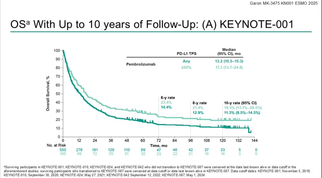 [1]Edward B. Garon, et al. 10-year outcomes from clinical trials of pembrolizumab (pembro) monotherapy for locally advanced or metastatic non-small cell lung cancer (NSCLC). 2025 ESMO. 3208P.