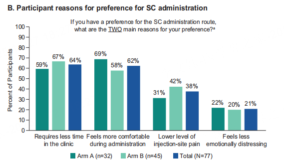 关于帕博利珠单抗皮下注射与静脉输注方式的患者偏好研究(3475-FF11)在今年的ESMO大会上公布的结果显示[3],在118名可评估患者中,65%明确表示更偏好皮下注射。患者选择皮下注射的主要原因包括缩短在院时间(64%)、注射过程更加舒适(62%)、注射部位疼痛更轻(38%)以及减轻心理负担(21%)。
